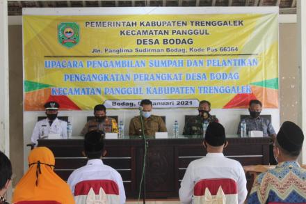 Pada hari ini Sabtu tanggal Sembilan bulan Januari Tahun 2021 yang bersangkutan telah resmi dilantik oleh Bpk. JUMANGAT, S.Pd selaku Kepala Desa Bodag Kecamatan Panggul disaksikan oleh Muspika Kecamatan Panggul dan seluruh elemen Pemerintah Desa Bodag serta masyarakat. Semoga dengan bertambahnya dua personil Perangkat Desa Bodag yang baru, akan lebih meningkatkan kinerja Pemerintah Desa Bodag serta meningkatkan pelayanan kepada masyarakat Desa Bodag khususnya dan Kecamatan Panggul umumnya.