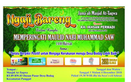 "Selalu Berfikir Positif Untuk Menjaga Kerukunan menuju Desa Bodag Lebih Baik" adalah tema yang diusung oleh Panitia "Ngaji Bareng" merupakan ajakan kepada seluruh warga Desa Bodag untuk saling berprasangka baik dalam kehidupan sehari-hari agar dapat menciptakan suasana harmonis diantara warga Desa Bodag sehingga tercipta Keserasian Sosial di Desa Bodag.