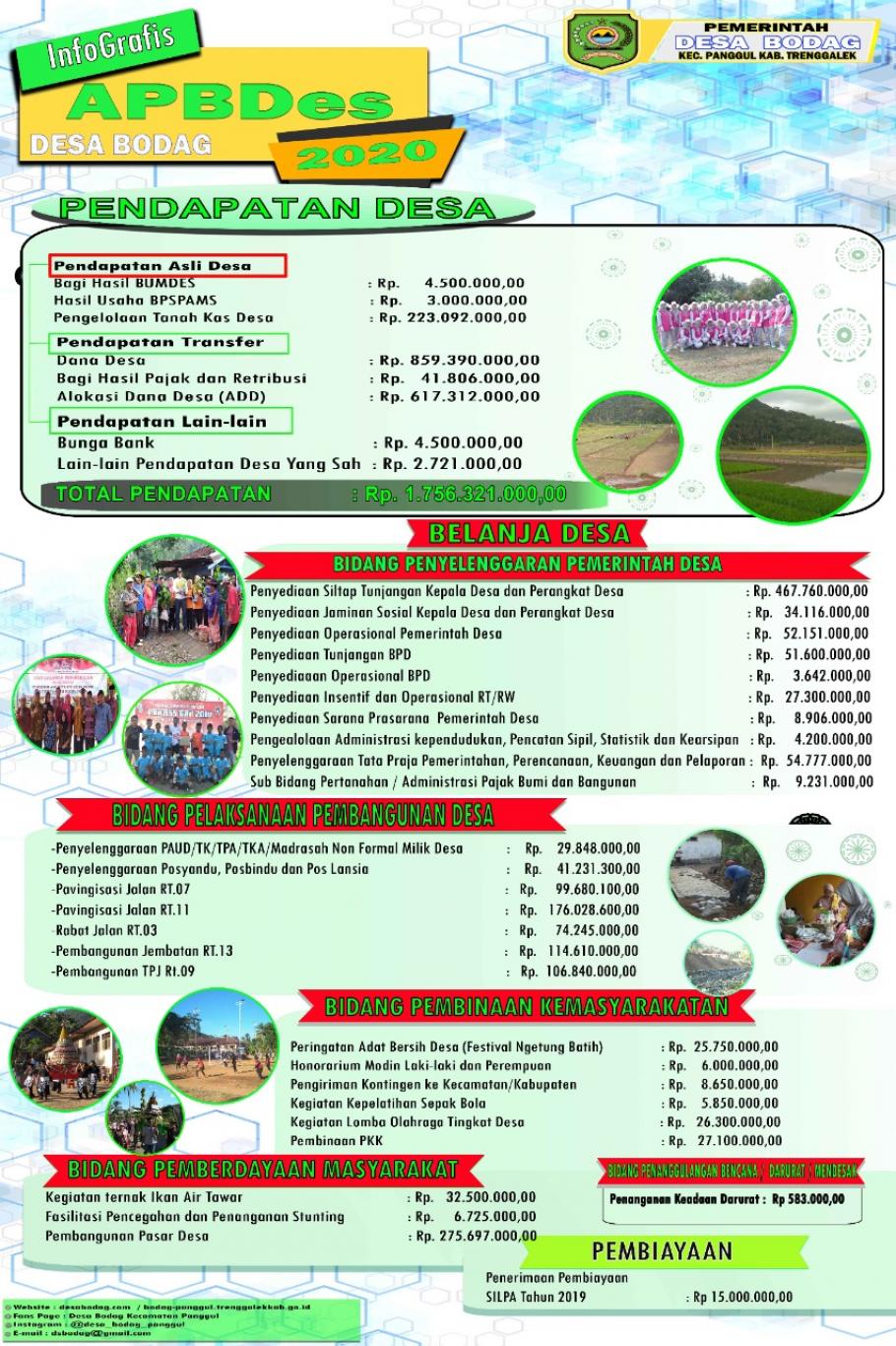 Berikut info grafis terkait Anggaran Pendapatan dan Belanja Desa Bodag Tahun 2020 yang disusun berdasarkan Peraturan Desa Bodag Nomor 7 Tahun 2019 tentang Anggaran Pendapatan dan Belanja Desa Bodag Tahun Anggaran 2020.